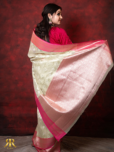 - Designs and Motifs: The saree typically showcases a blend of traditional Banarasi patterns with Mina work, such as buttas, floral vines, or peacock motifs, often placed across the body and pallu. The overall aesthetic is one of grandeur, with vibrant contrasts created by the interplay of metallic threads and the soft sheen of the silk.